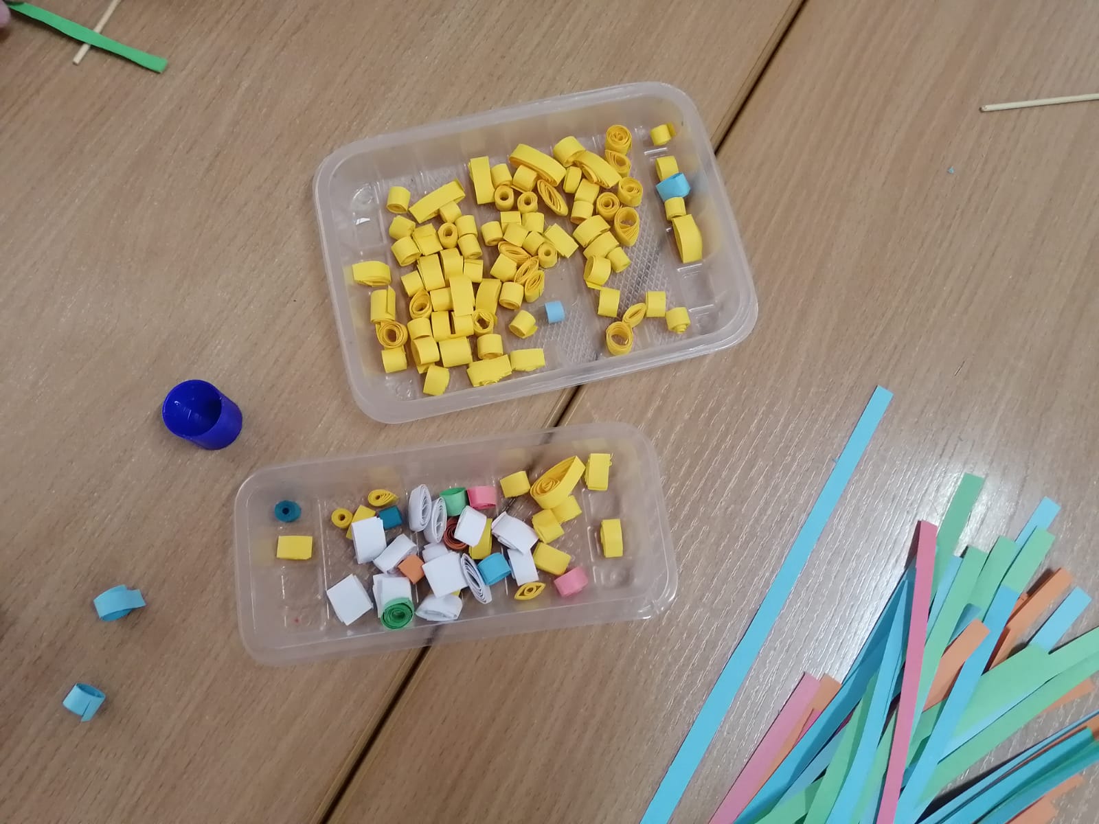 Сначала наши маленькие мастера внимательно слушали, как правильно подготовить бумагу и какие инструменты нам понадобятся. А потом началось самое интересное! Каждый реб ё нок выбрал свои любимые цвета и принялся скручивать бумажные ленточки в тугие спирали, капельки, глазки и другие фигурки.