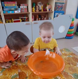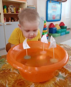 Теперь поставим стаканчик в морозилку или на улицу и подождём, пока вода полностью замёрзнет. Когда вода превратится в лёд, достанем наш кораблик из стаканчика. Вот он — настоящий ледяной корабль! Теперь опустим его в тазик с водой… Ура! Наш ледяной кораблик плывёт! Вот так мы узнали, что лёд может плавать. Здорово, правда?