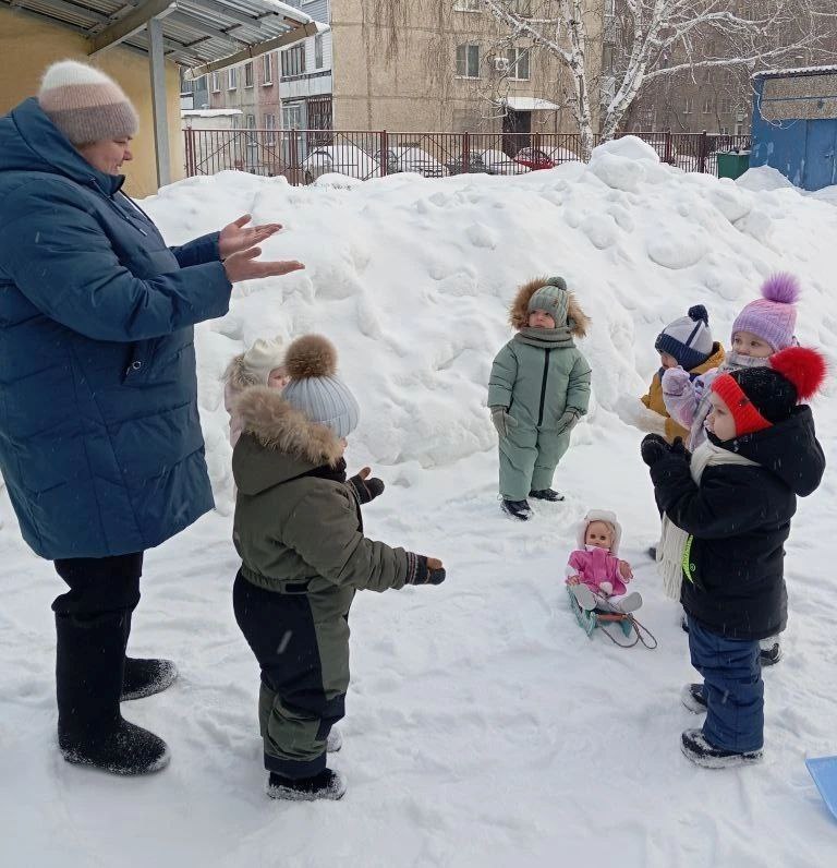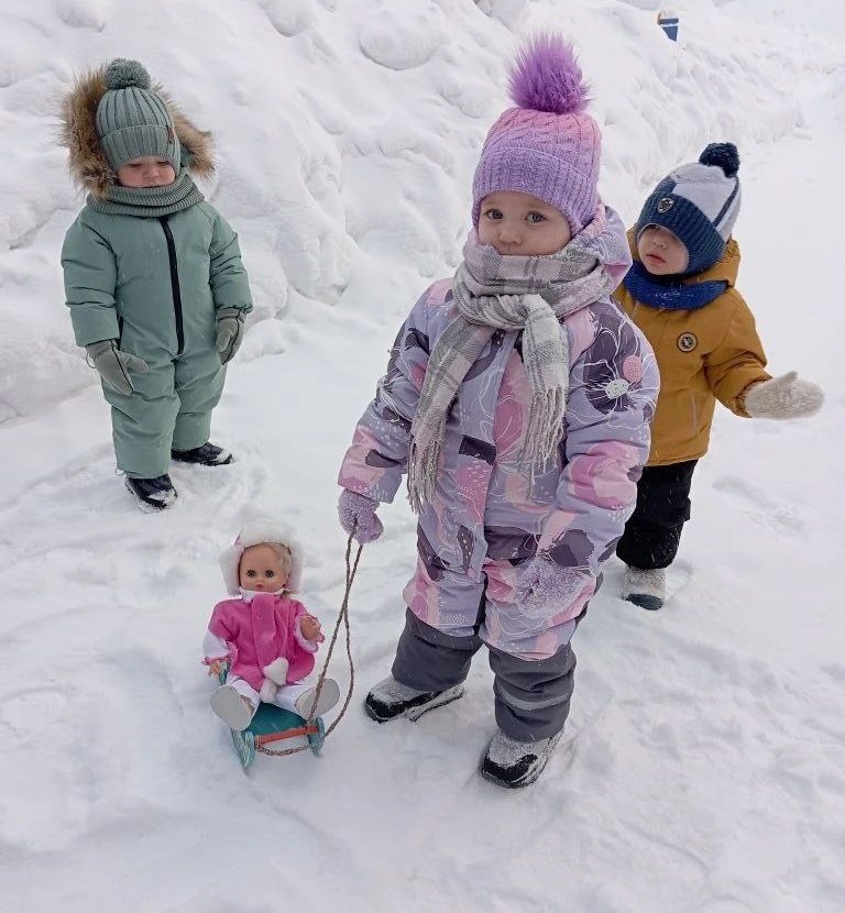 Малыши на прогулке с удовольствием катали на санках куклу Катю. Они усадили куклу на санки и по очереди тянули их по заснеженной дорожке.