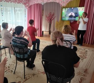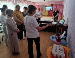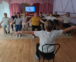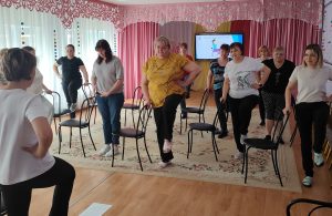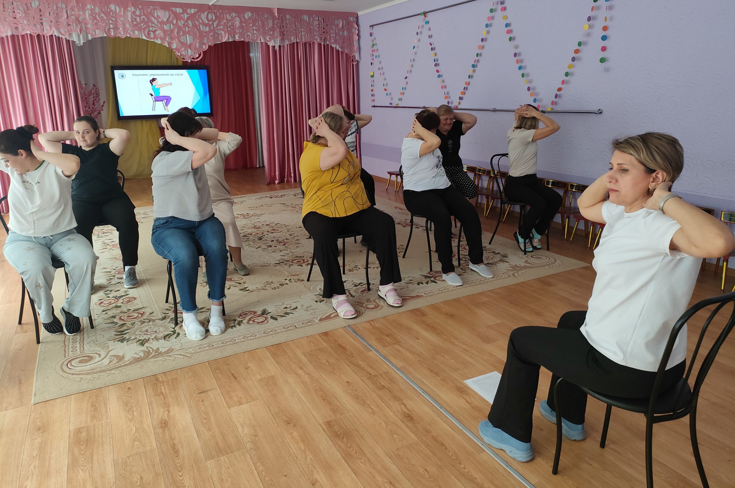 Следующим этапом стало проведение комплекса производственной гимнастики на стульях. Сотрудники дружно выполнили комплекс упражнений, направленных на снятие мышечного напряжения и эмоционального утомления. Веселая атмосфера и активные движения зарядили всех бодростью и улучшили самочувствие.